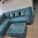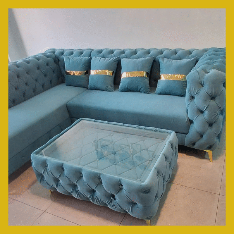 premium Chesterfield L-shape sofa in luxurious sky blue Fabric